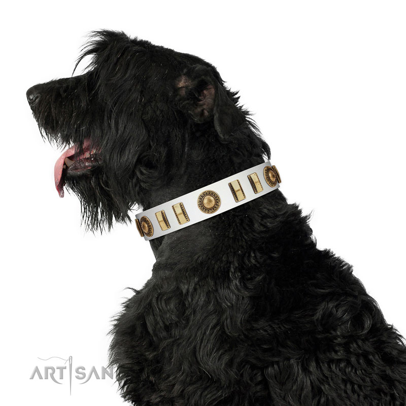 FDT Artisan White Leather Black Russian Terrier Collar with Durable Old-Bronze Plated Steel Hardware