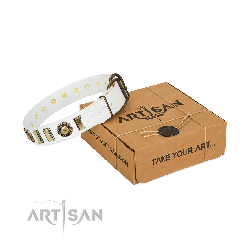 Adornments of the tool are second to none! FDT Artisan have done an excellent job and created a collar that could compete with the most delicate dog accessories in their elegance and style. Old bronze like plates and brooches make the collar unbelievably chic and one of a kind. Their matchless look will add a special gloss to your dog's appearance. Besides, the embellishments go well with the white color of the accessory. Your furry friend may run, jump, roll, play- enjoy his/her walking and the adornments won’t fall out since they are riveted.