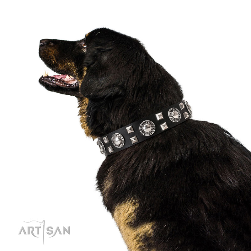 A collar for a dog, almost like a tie for a person, reminds one of the status and certain behaviour, in the case of a dog, it reminds of good behaviour and obedience. There are, of course, individual individuals, and in the canine world, which is nothing to do with, but basically, the collar pacifies the dog, makes it calmer and more obedient, disciplines and ensures self-control. Our FDT Artisan collection is so huge! Just have a look at this one! FDT Artisan beautiful black leather dog collar! It is made of high-quality material and has gorgeous decorations! Your dog will receive a lot of compliments from others! Just buy and see by yourself!
