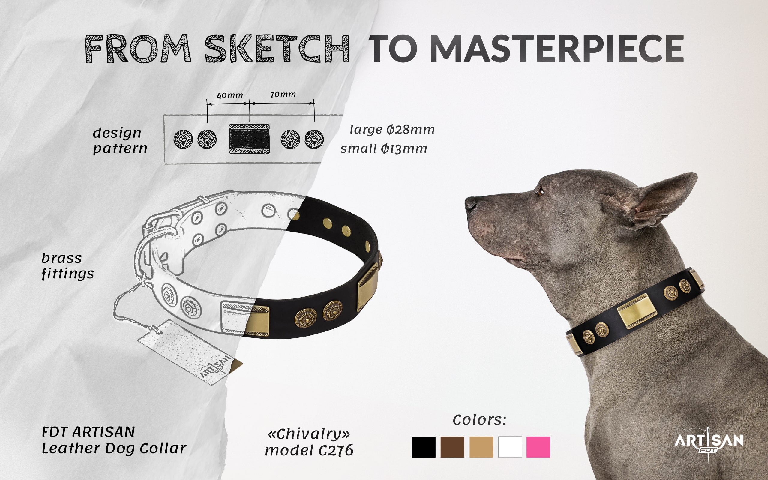 Model: C276#1073 Leather Dog Collar with Old Look Decorations - 1 1/2 inch (40 mm)