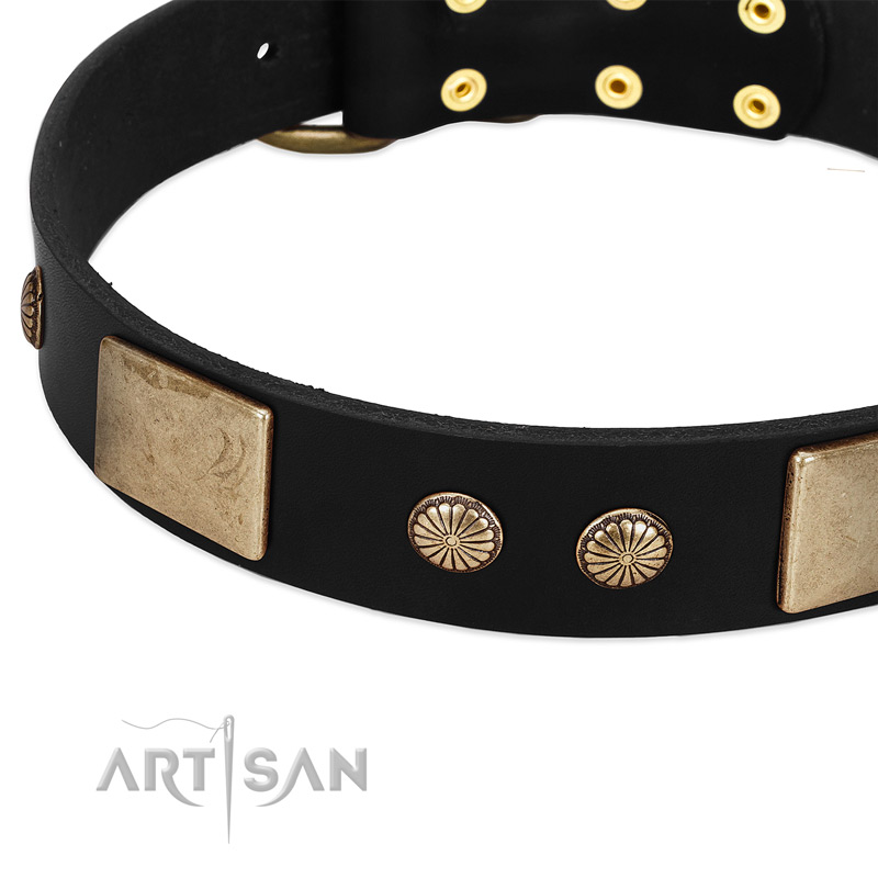 Another advantage of this dog collar is surely its design. Nobody will argue the fact that this collar looks like a necklace due to old bronze-like decorations. Don't neglect your dog in his right to be stylish during his daily outings. Massive square plates are set by means of two brass rivets each to ensure they won’t fall off under the pressure. The same procedure was established with the small flower-style studs set in between the plates.