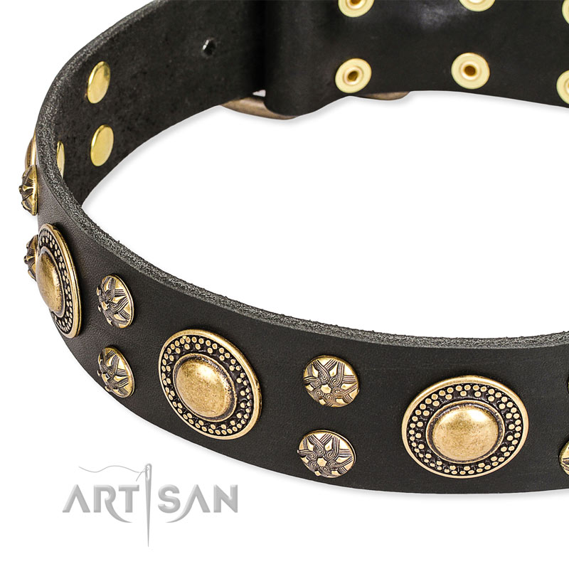 This leather dog collar with massive golden-like circles is above competition. The adornments come of different size alternating each other. Old bronze-like plating is hypoallergenic and