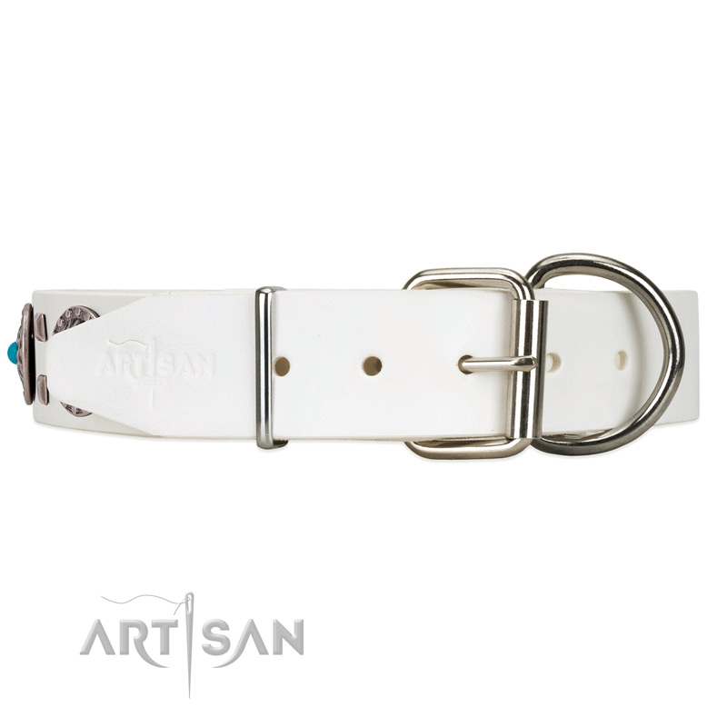 designer studs, decorated with little blue stones look perfectly on white leather. This combination is called harmony. Harmony of pure elegance and quality! Wearing this collar, your dog will not go unnoticed!