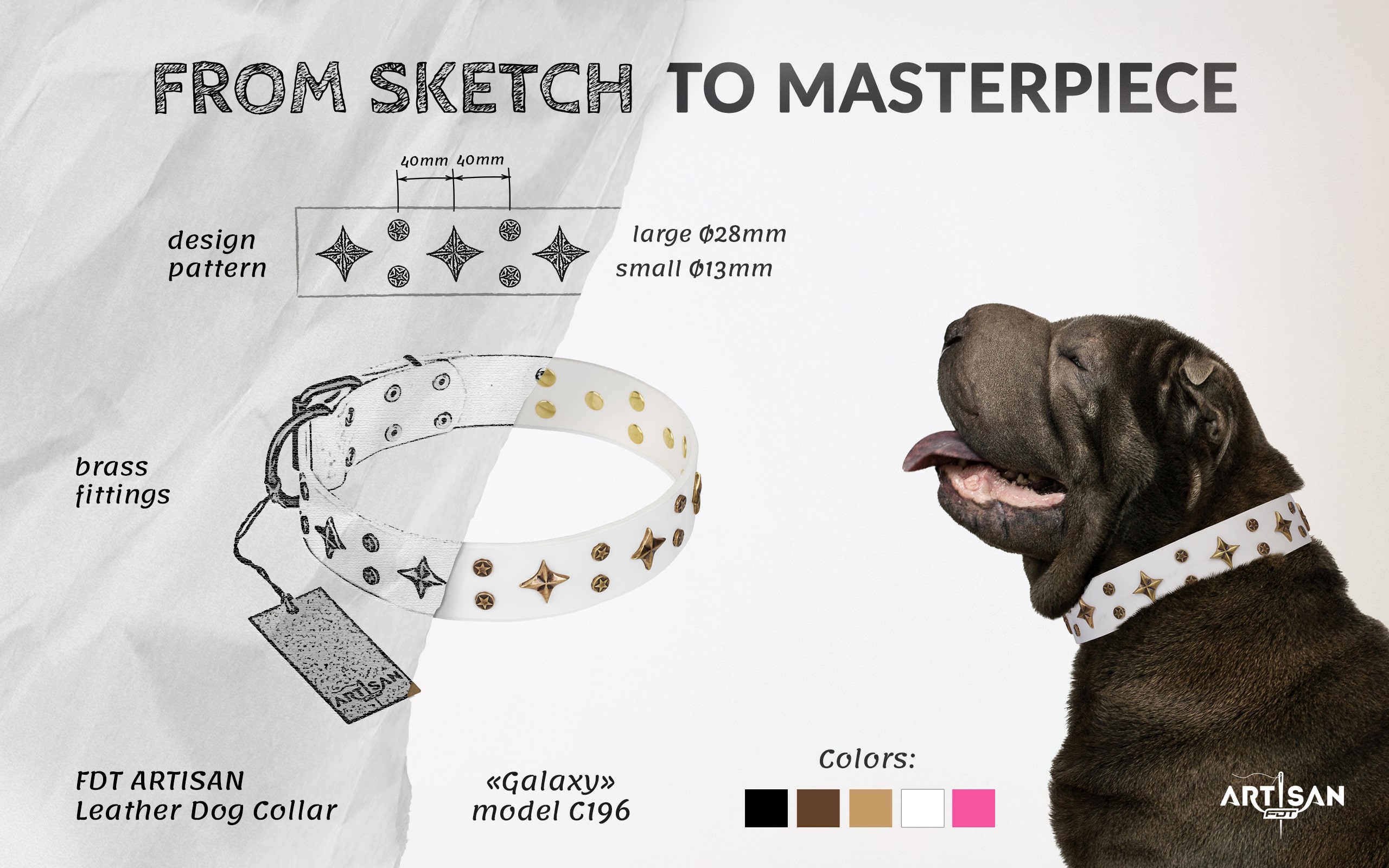 Galaxy Style Decorated White Leather Dog Collar with Brass Plated Hardware