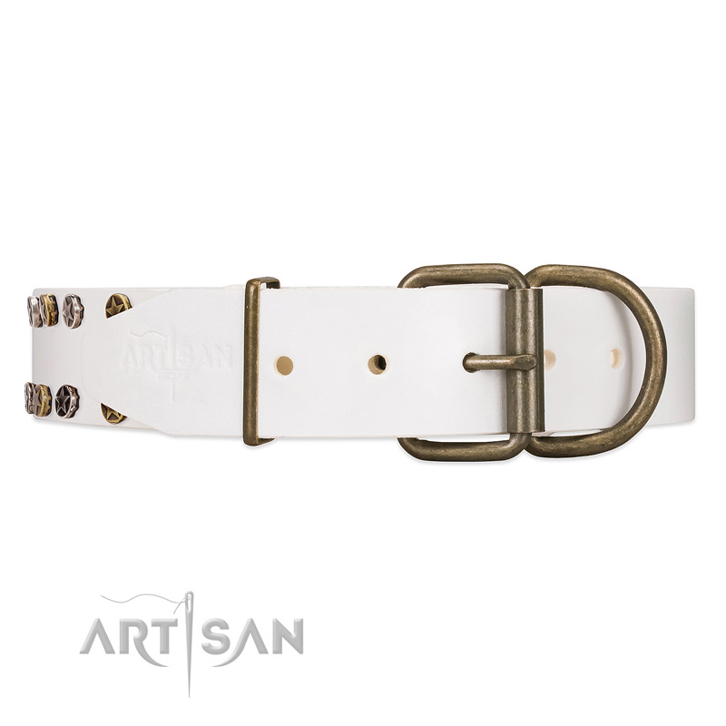 Extraordinary white leather dog collar with tremendous decorations