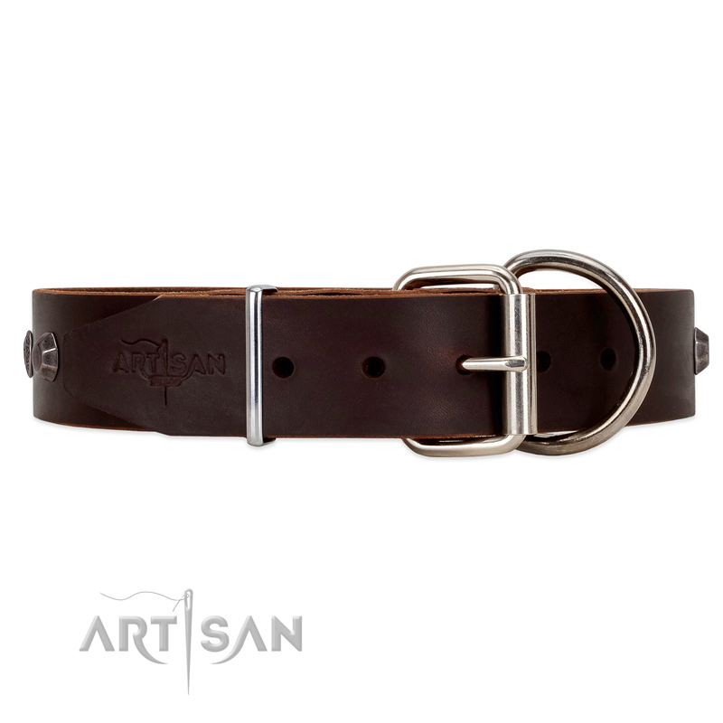 A brown leather strap is decorated with a set of chrome plated studs. Each piece of adornment has its own rivet. The hardware matches the adornments perfectly. Both the buckle and the D-ring are made of chrome plated steel. A traditional buckle is used to put the collar on and take it off fast. The D-ring enables to attach a leash easily. Thus, these rust resistant metal parts will serve your dog for a long period of time and will make the process of the collar using easy.