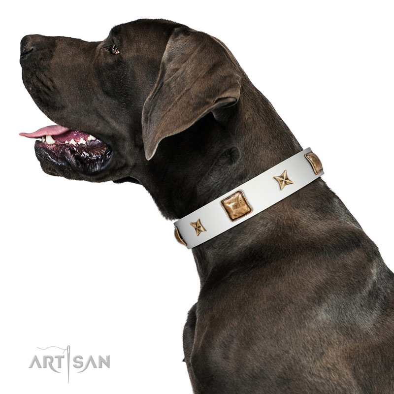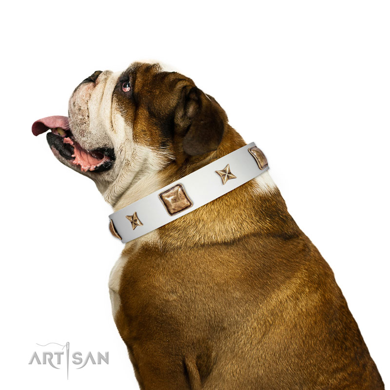 Top-notch white leather English Bulldog Artisan leather collar for pleasant wear