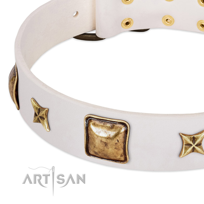 If you are fed up with ordinary dog accessories that do not inspire you, it is high time to try something new! So, dear customer, you are presented a superb dog supply – this White Leather Dog Collar Adorned with Stars and Squares designed and produced by FDT Artisan. Why not to try this one? It looks extraordinary due to special decorations and white color.