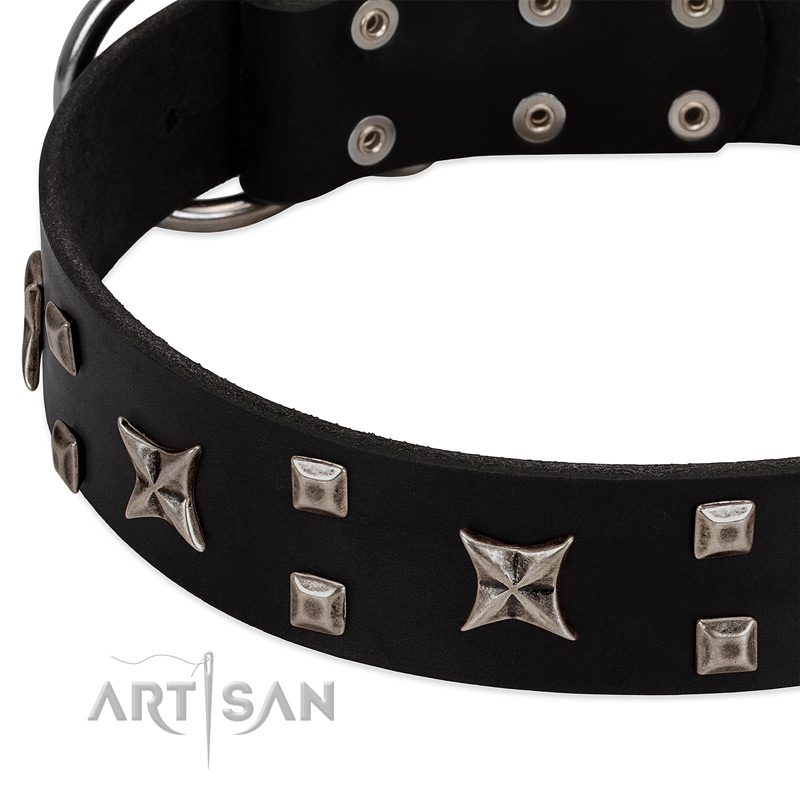 Let your pooch look elegant on his daily walks. Studs and stars are set by means of brass rivets to ensure they won’t fall off under the pressure. Let your precious dog rock even if you are going out to the shop or have a usual walk in the park! Your canine must look irresistible any time! This collar is 5 ways adjustable, so if your pet's weight will change slightly, the only thing you should do is to use the other hole on the collar. It's a perfect solution! A belt-type fastener helps to buckle the gear on your doggy's neck without wasting time. Also, there is a massive D-ring which serves for attaching a leash or ID tag, so you'll have no problems with it. And all the metal parts (including decorations) are rust resistant.