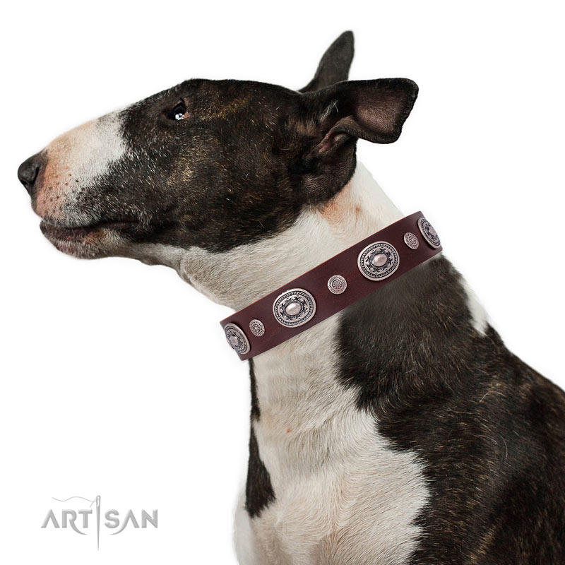 Bull Terrier comfortable full grain natural leather dog collar with decorations