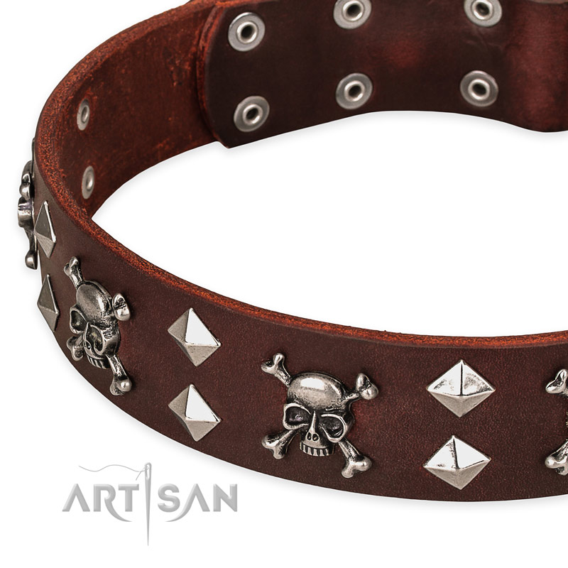 smart design provides simplicity. This stylish leather dog collar in more than decoration, it is suitable for showing, training and everyday use. The accessory is decorated with silver-like skulls with bones and faceted studs. They are chrome plated and emit beautiful silver shining. The adornments are set in one row and reliably riveted. This stunning leather dog collar with studs is a successful example of