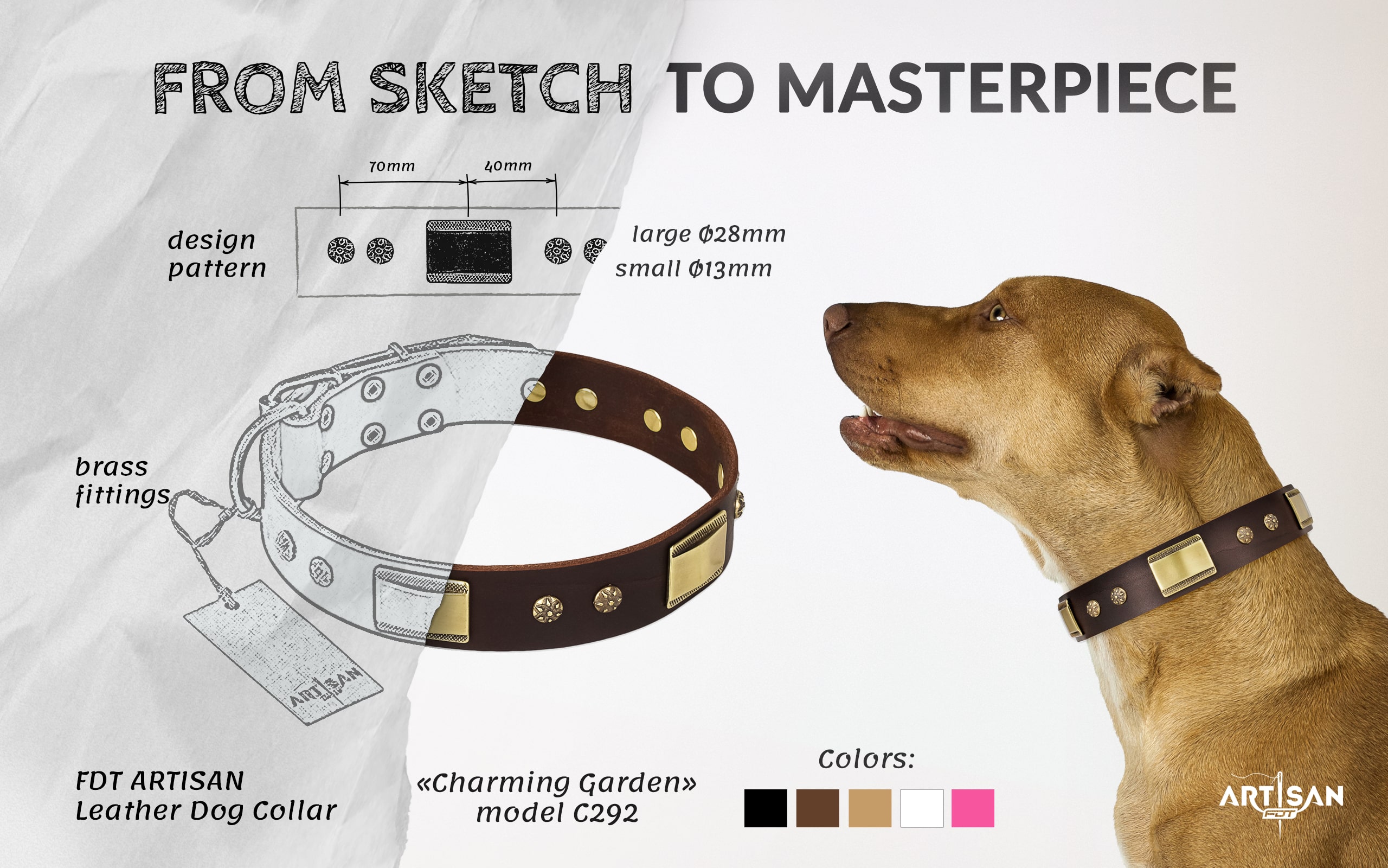Charming Garden Style Decorated Brown Leather Dog Collar with Chrome Plated Hardware