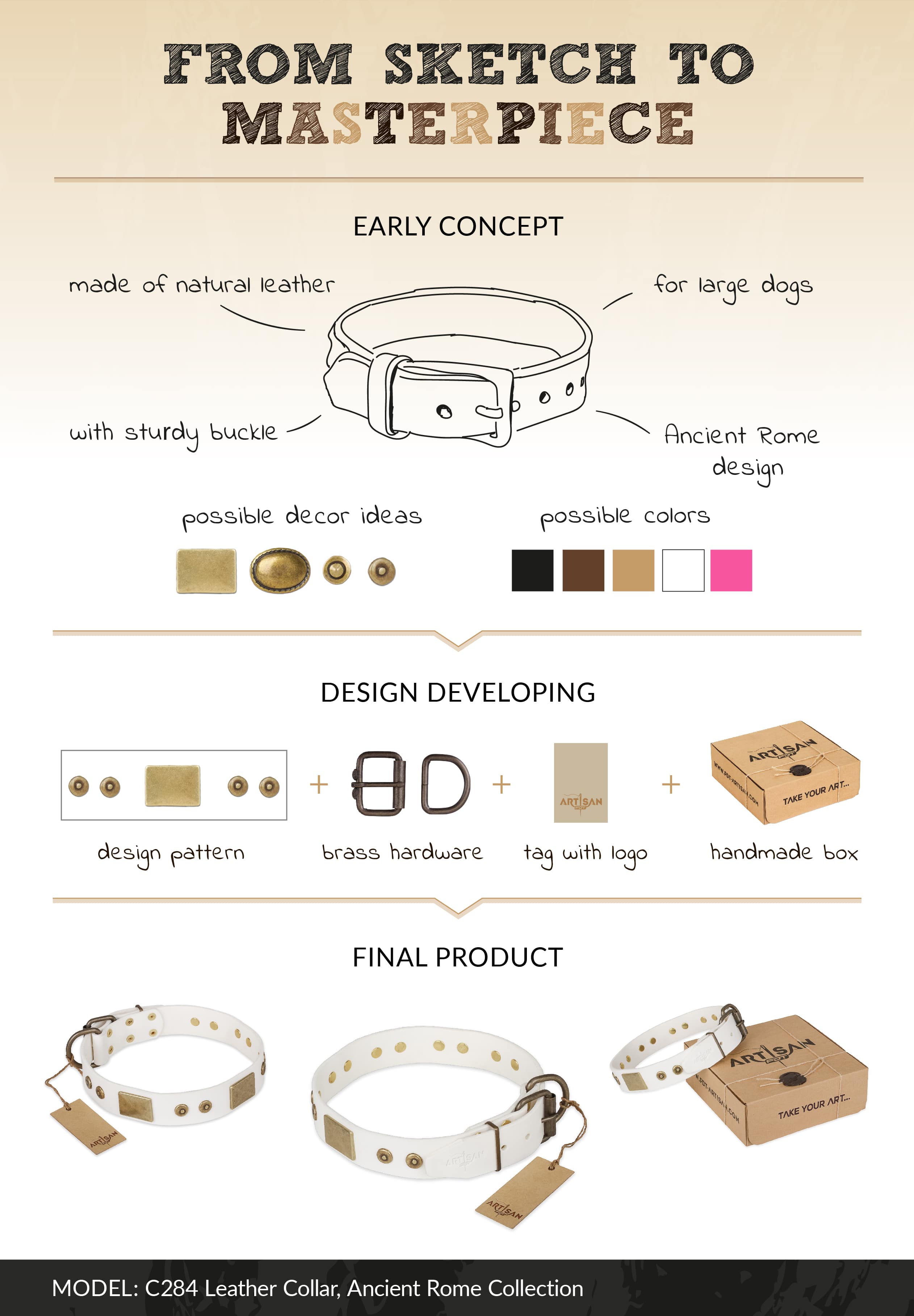 Ancient Rome Style Decorated White Leather Dog Collar with Brass Plated Hardware