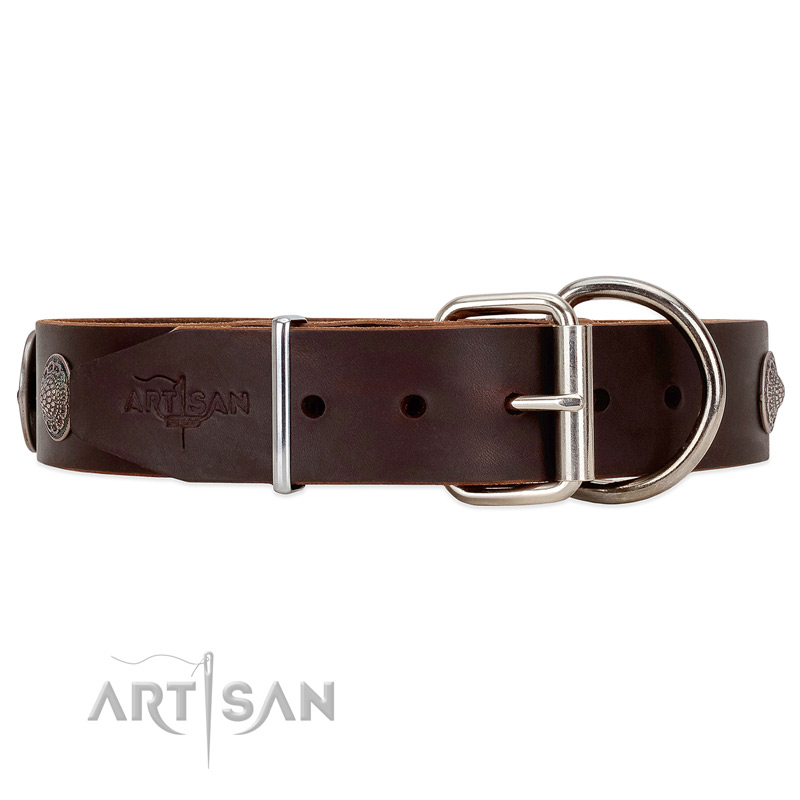 Usually, dogs of the same breed look alike. However, you may easily help your dog to differ from others. With this FDT Artisan leather collar on your pet, you will always see the difference not only in character or name, but also in dog's appearance. No dog in your neighbourhood will have such a stylish leather collar with amazing decorations! Buy this canine accessory and make your dog original!