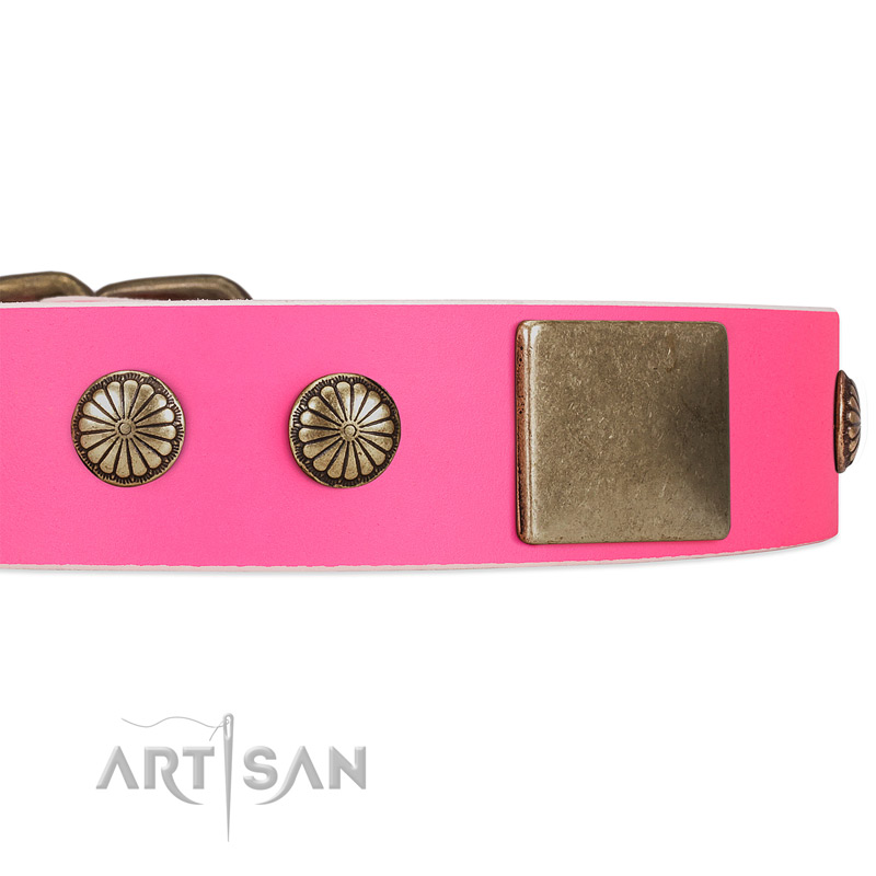 The design of the collar fascinates and astonishes. Old bronze-like decorations is a perfect match for leather strap, that creates an impression of unveiled luxury. Massive round plates and studs with flower ornament are installed along the collar and securely riveted to stay there almost forever. And what about the color? Pink matches lady dogs perfectly, don't you think so? Thus, it is one more advantage of this collar to consider when choosing a collar for your pet.