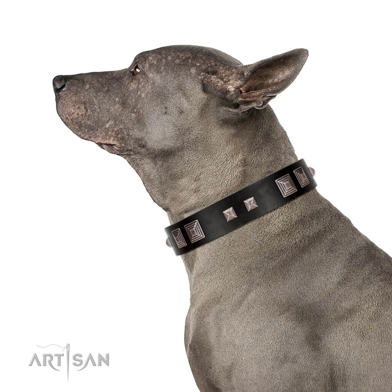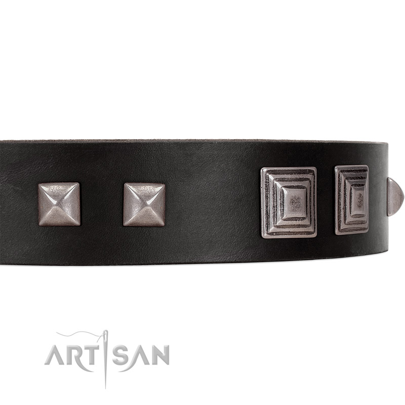 Handmade exclusive FDT Artisan black leather dog collar with square studs and pyramids
