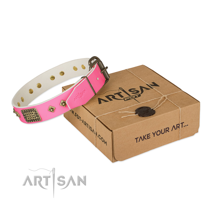 Are you a fan of incredible beauty, comfort and style? Pamper your dog and order this superior pink leather collar! This accessory comes in fashionable design, it is decorated with old bronze-like plated plates and round studs. These decorations emit golden-like shining and create dazzling effect.