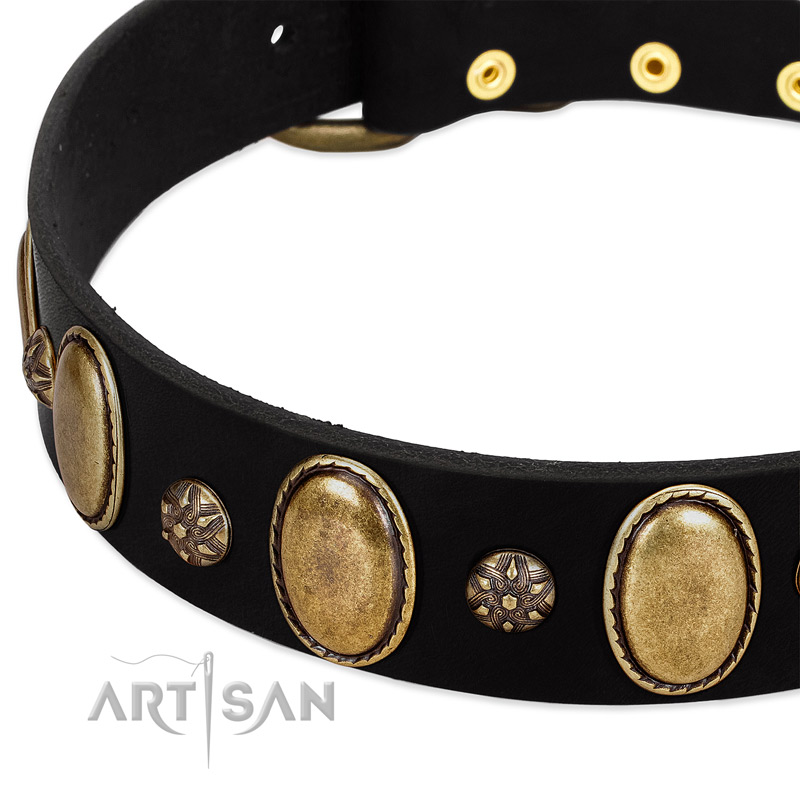 Face it, the first thing that rivets your attention is the sophisticated design of this accessory. Oval plates with beautiful framing and round engraved studs have an old-bronze-like plating that makes the adornments look like a vintage jewelry. They give this collar extra chic look. Your dog deserves to catch everybody's attention.
