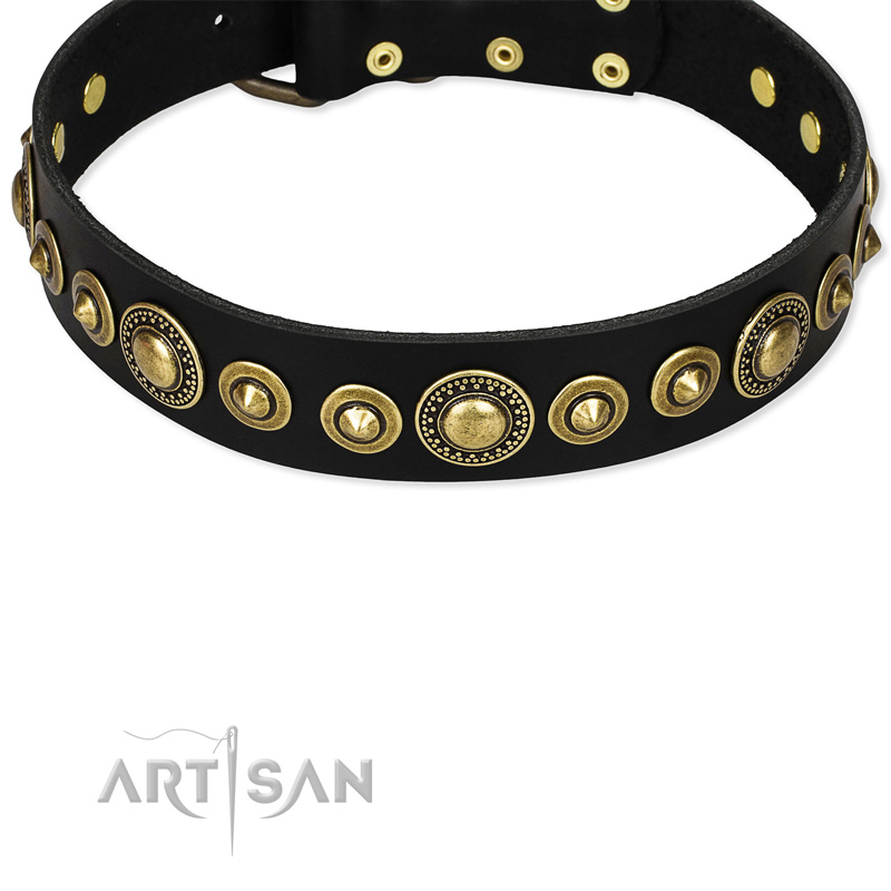 Looking for a stylish leather collar to put an accent on your dog's nobility and beauty? This exclusive designer leather collar will satisfy the requirements even of a fussy customer. You will like the touch and look of this fashionable gear especially when it is on your pet's neck. Incredibly beautiful golden-like round studs adorn this piece of dog equipment. To match them, the hardware is old bronze-like plated steel emitting the same golden shining.