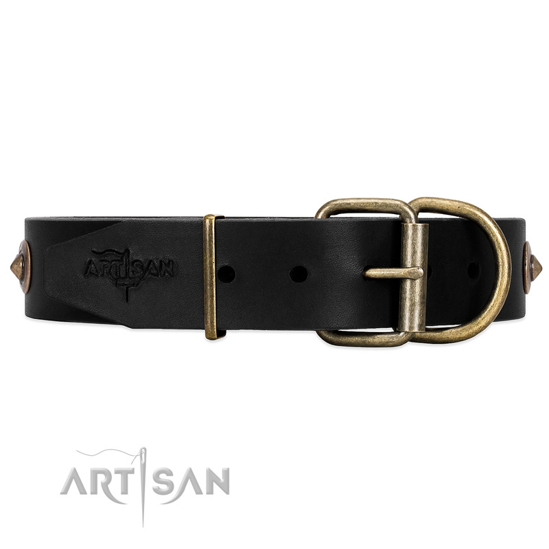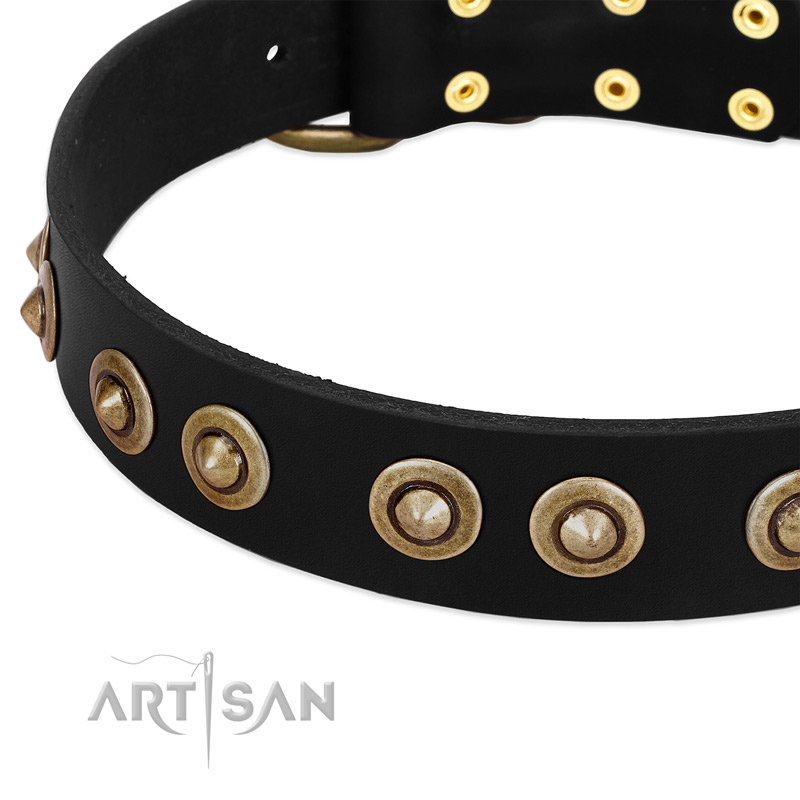 The design of the collar is elegant and unusual, so it will look great on every dog. No matter when and where your dog will appear in this masterpiece, he/she will surely attract much attention. Old bronze plated large studs are put along the leather strap. Their mat cover spread the air of antique culture. Exquisite in style, the studs are also reliably fixed not to fall accidentally during active games.