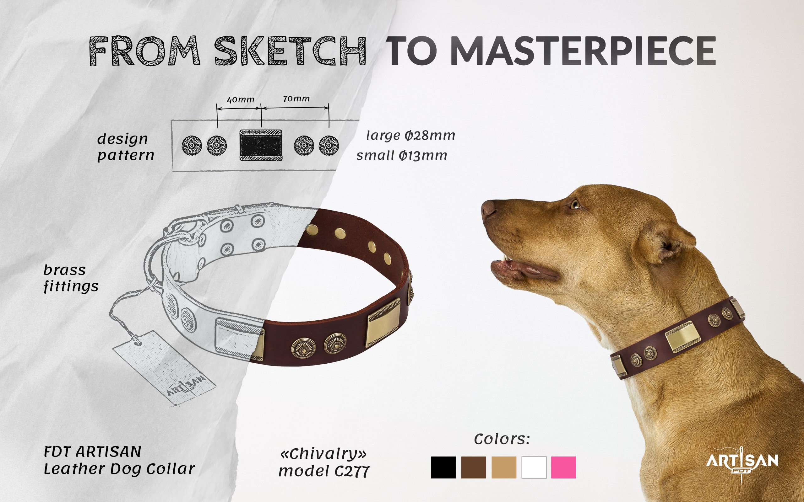 Chivalry Style Decorated Brown Leather Dog Collar with Brass Plated Hardware