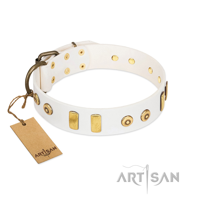 Amazing White Leather Dog Collar with Exclusive Goldish Studs and Tiles