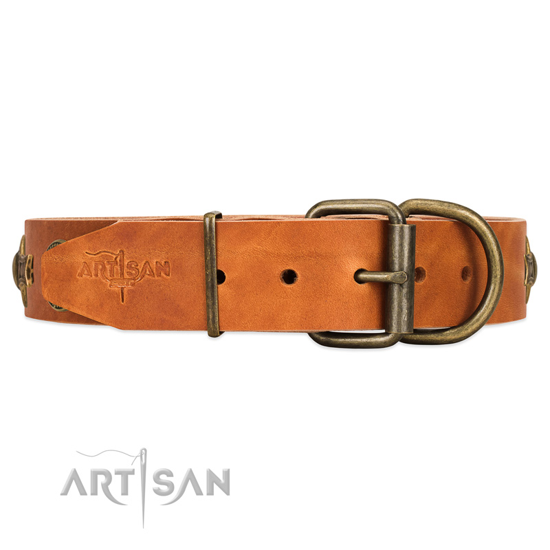 FDT Artisan natural leather dog collar with brass decorations