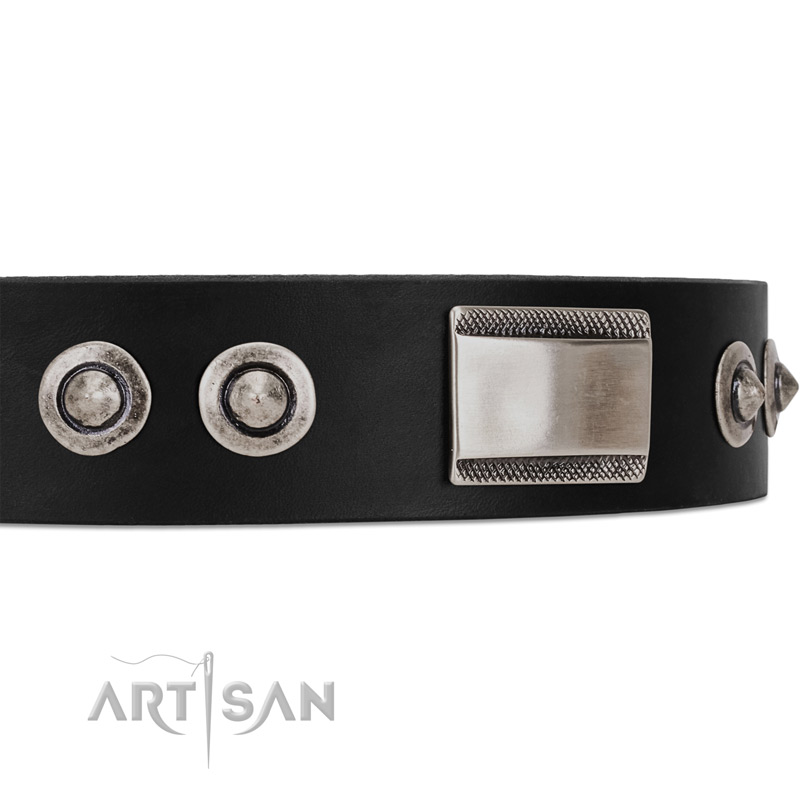 Black leather strap is adorned with a set of chrome plated spiked studs and plates. Each piece of decoration has its own rivet, therefore, they won’t fall off the leather strap. Due to embellishment, the collar looks like a necklace. This black FDT Artisan will accentuate beauty of your canine. The hardware matches the adornments perfectly. Both the buckle and D-ring are made of steel with a special chrome plating. A traditional buckle is used to put the collar on and take it off quickly and the D-ring enables to attach a leash easily. Thus, these rust resistant metal parts will serve your dog during a long period of time and will ease the process of using the collar.