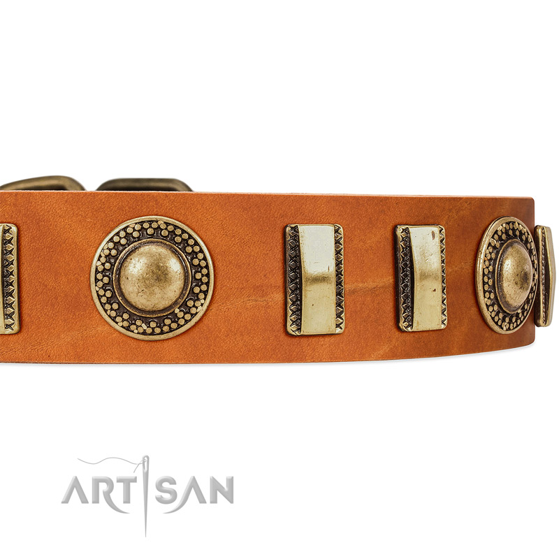Have a look at the decorations of the collar! FDT Artisan have done an excellent job and created a collar that could compete with the most delicate dog accessories in their charm and elegance. Old-bronze plated tiles and circles make the collar unbelievably stylish and unique. Their antique look will add a special gloss to your dog's appearance. Moreover, the embellishments go well with the tan color of the accessory. Each plate is fixed with two rivets. Your furry friend may run, jump, roll, play- enjoy his/her walking and the adornment won’t fall out.