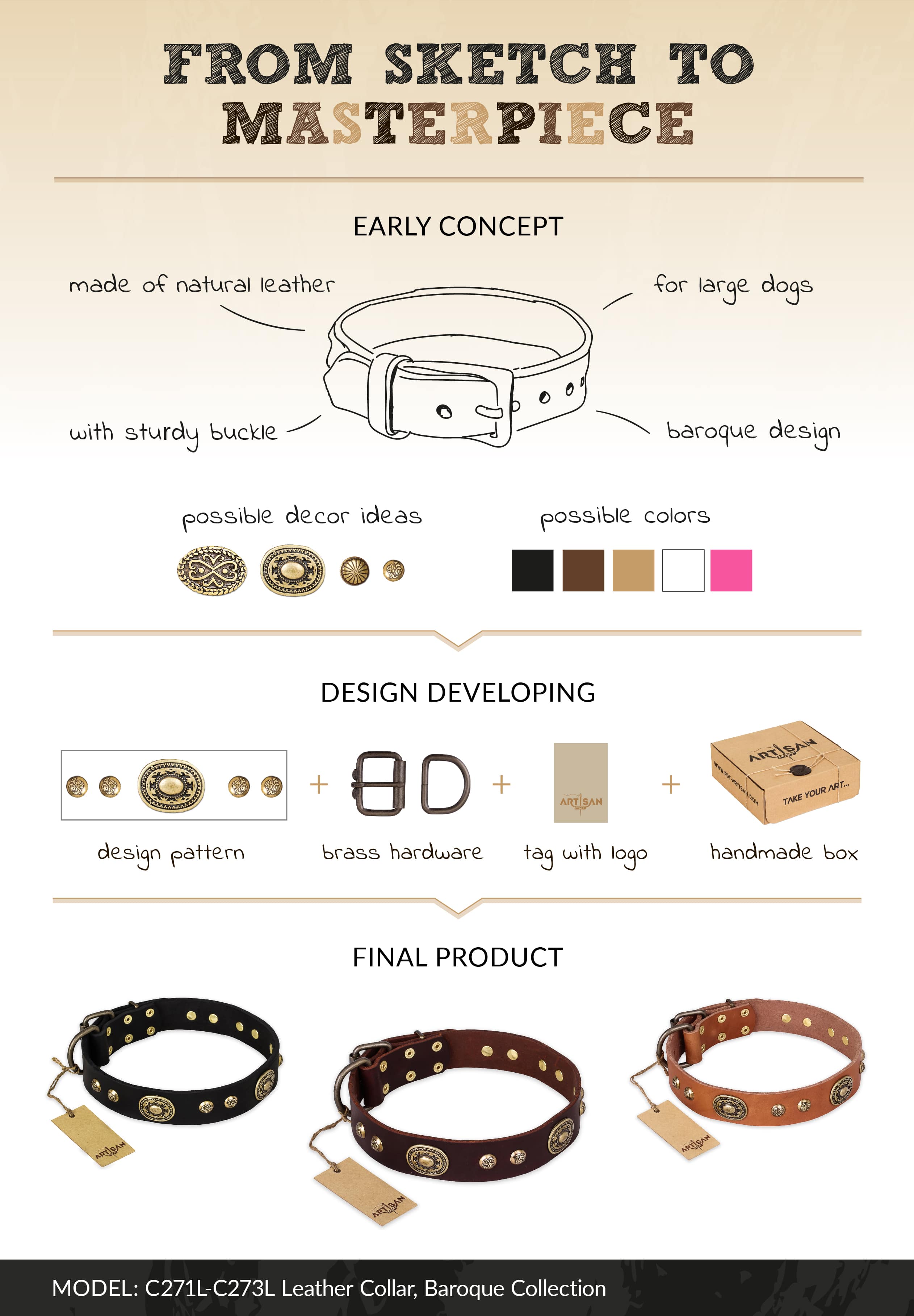 Looking for an inimitable leather collar for your dearest pet? This presented collar of handwork, individual design and the highest quality is to your attention. This genuine leather accessory corresponds to the necessary world standards, therefore it is absolutely safe for the dog. Wearing this unique accessory, your dog won't suffer from any skin problems. Natural leather is soft to touch, doesn't stretch, tear or wear. So, this tool is comfortable and reliable. Believe, this is not hot air, check the quality and stay satisfied!