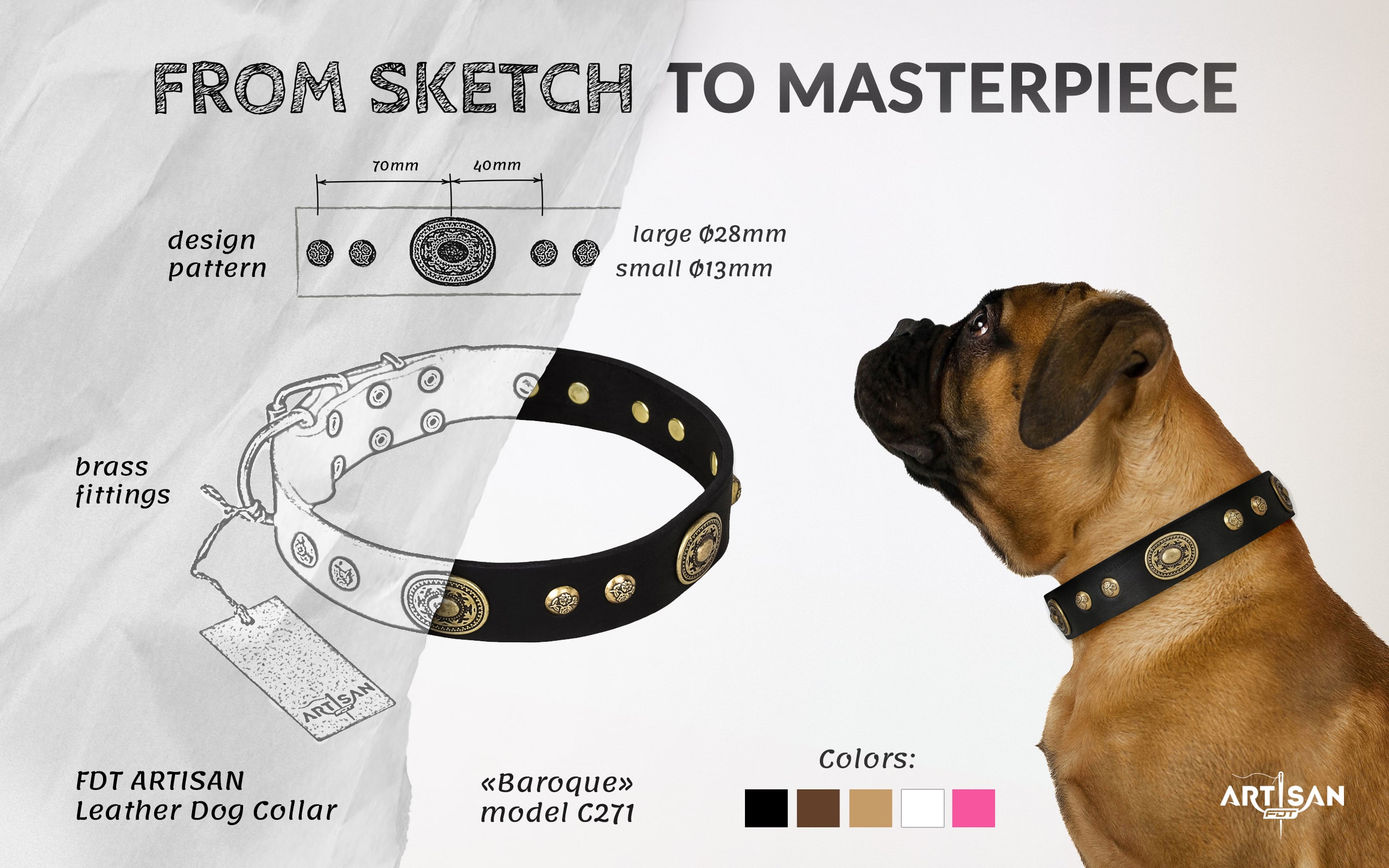 Baroque Style Decorated Black Leather Dog Collar with Brass Plated Hardware