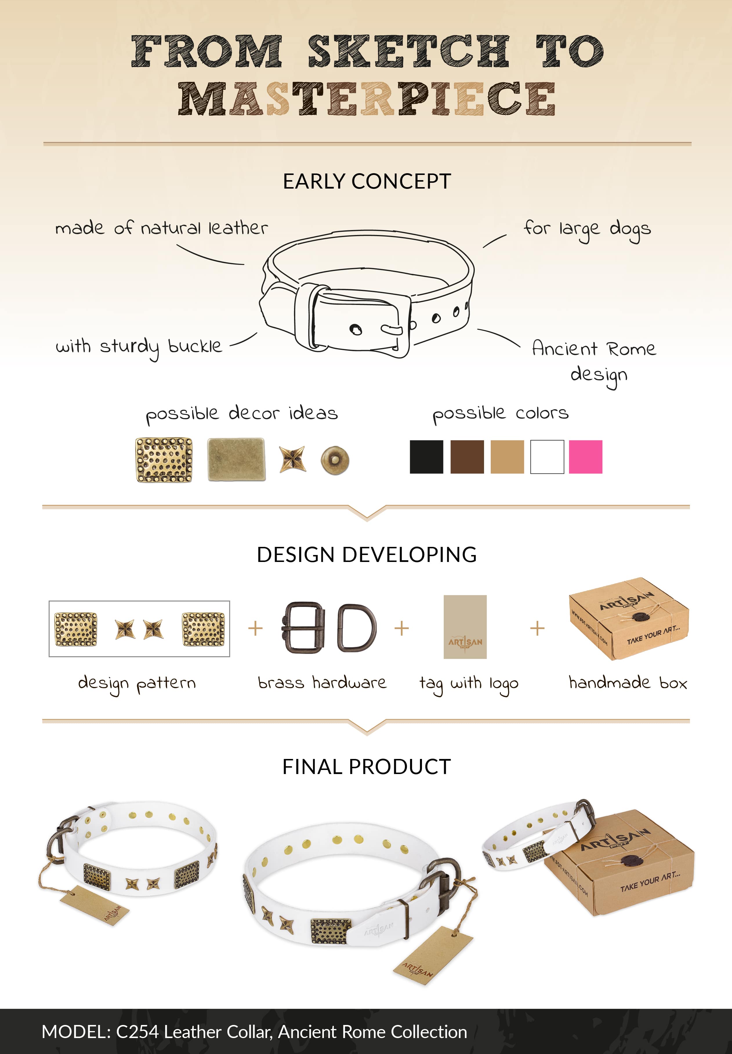 Ancient Rome Style Decorated White Leather Dog Collar with Brass Plated Hardware
