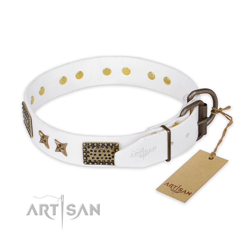 FDT Artisan Fancy White Leather Dog Collar with Plates and Stars