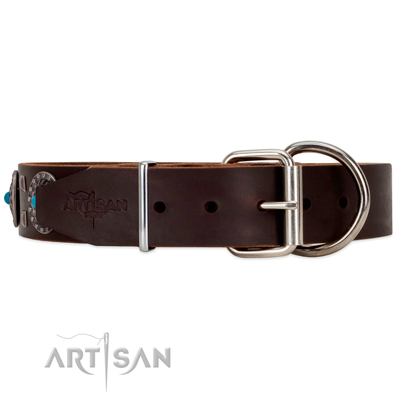 Exclusive leather dog collar with unique brooches with a blue stone in the center