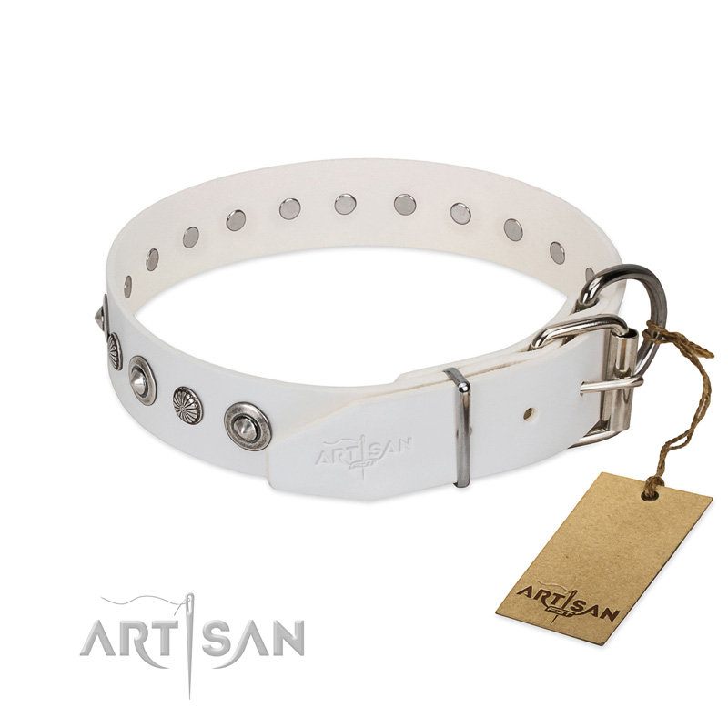 Design of the collar is matchless! White leather strap is adorned with a set of silver-like plated conchos. Each piece of decoration has its own rivet, therefore, they won’t fall off the leather strap. Due to embellishment, the collar looks like a necklace. This white FDT Artisan will accentuate beauty and purity of your canine.