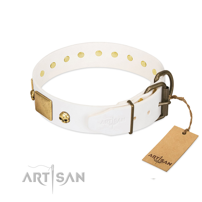 Feel the spirit of adventures! Buy the best ever collar for your precious doggie - White Leather Dog Collar Adorned with skulls and massive plates!