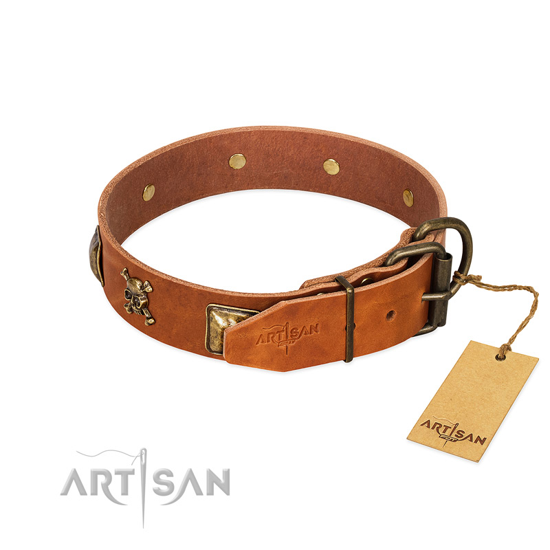 Artisan tan leather dog collar adorned with skulls and crossbones in combination with squares