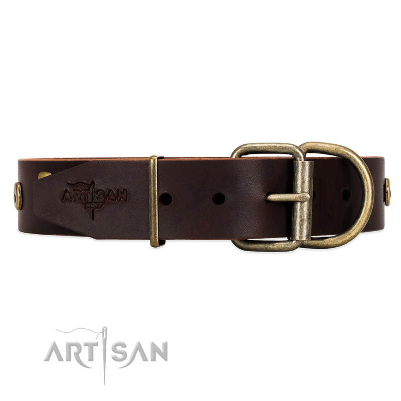 • "Lord of Dogs" FDT Artisan Brown Leather Dog Collar with Old Bronze-like Dotted Studs and Tiles