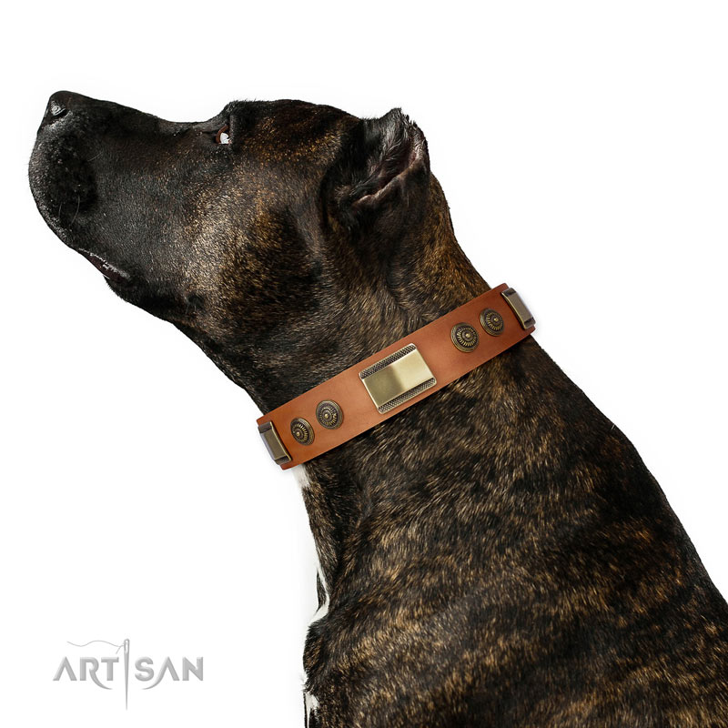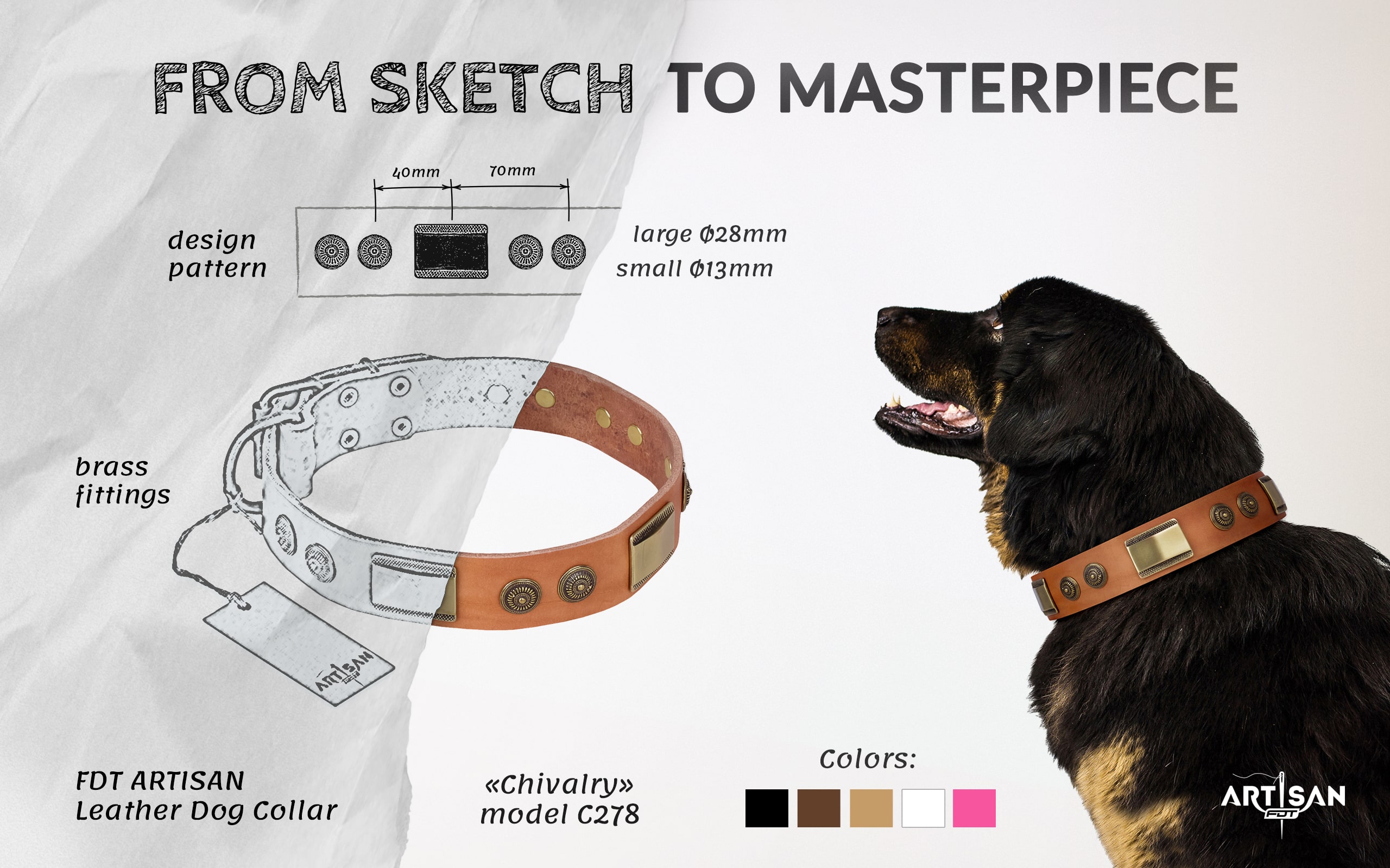 The Custom Leather Dog Collar is ultra soft as it is made of luxurious genuine first-class leather. It is finished with bright gold colored brass-plated hardware. Large brass plated plates resemble armour of medieval habitant. The collar is easy to adjust as snug as possible. The buckle is regulable and provides secure fit of this gear. D-ring is meant for leash and tags. The collar is available in tan color. It is collar is also convenient because it is quite wide - 1 1/2 inch (40 mm).