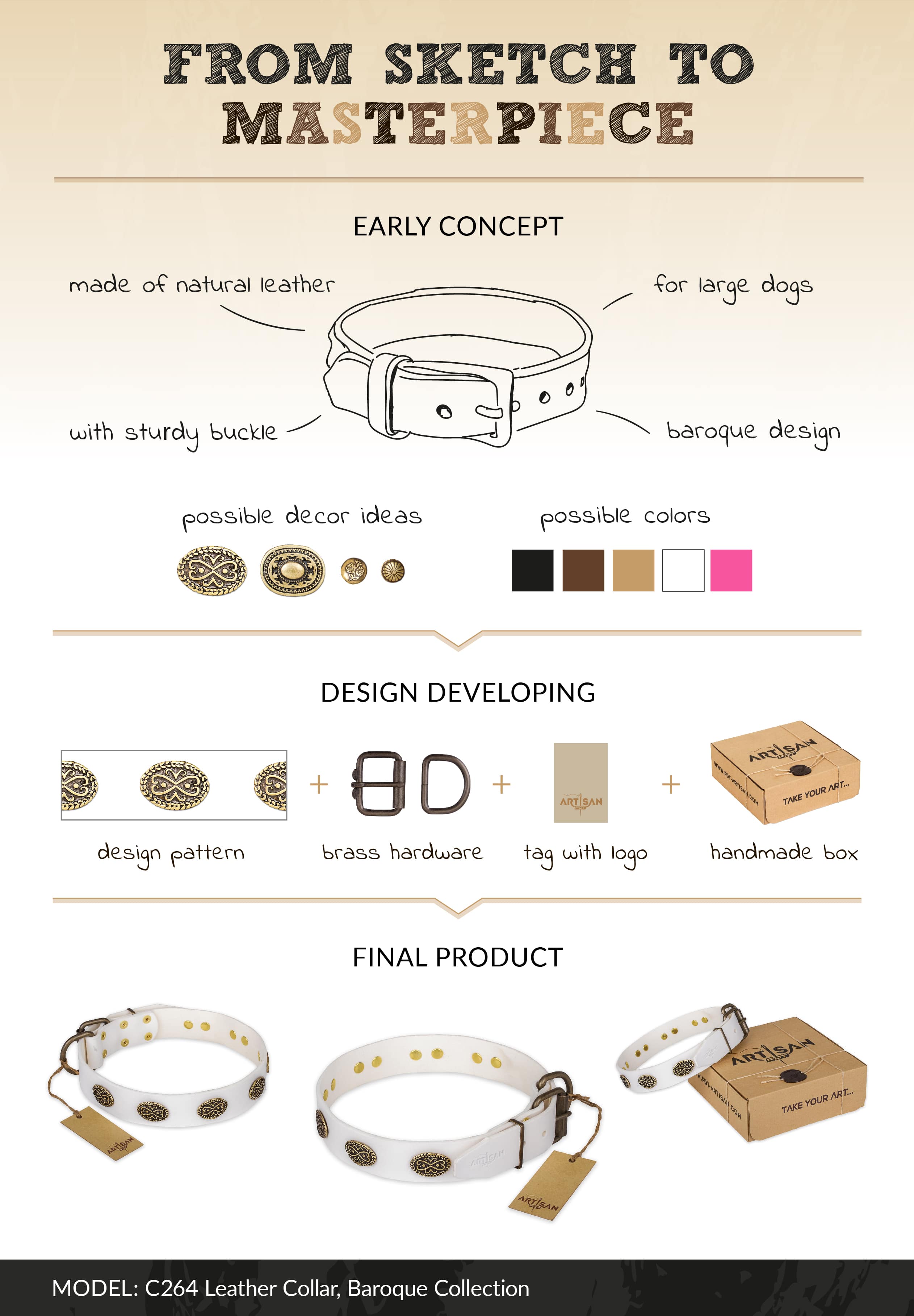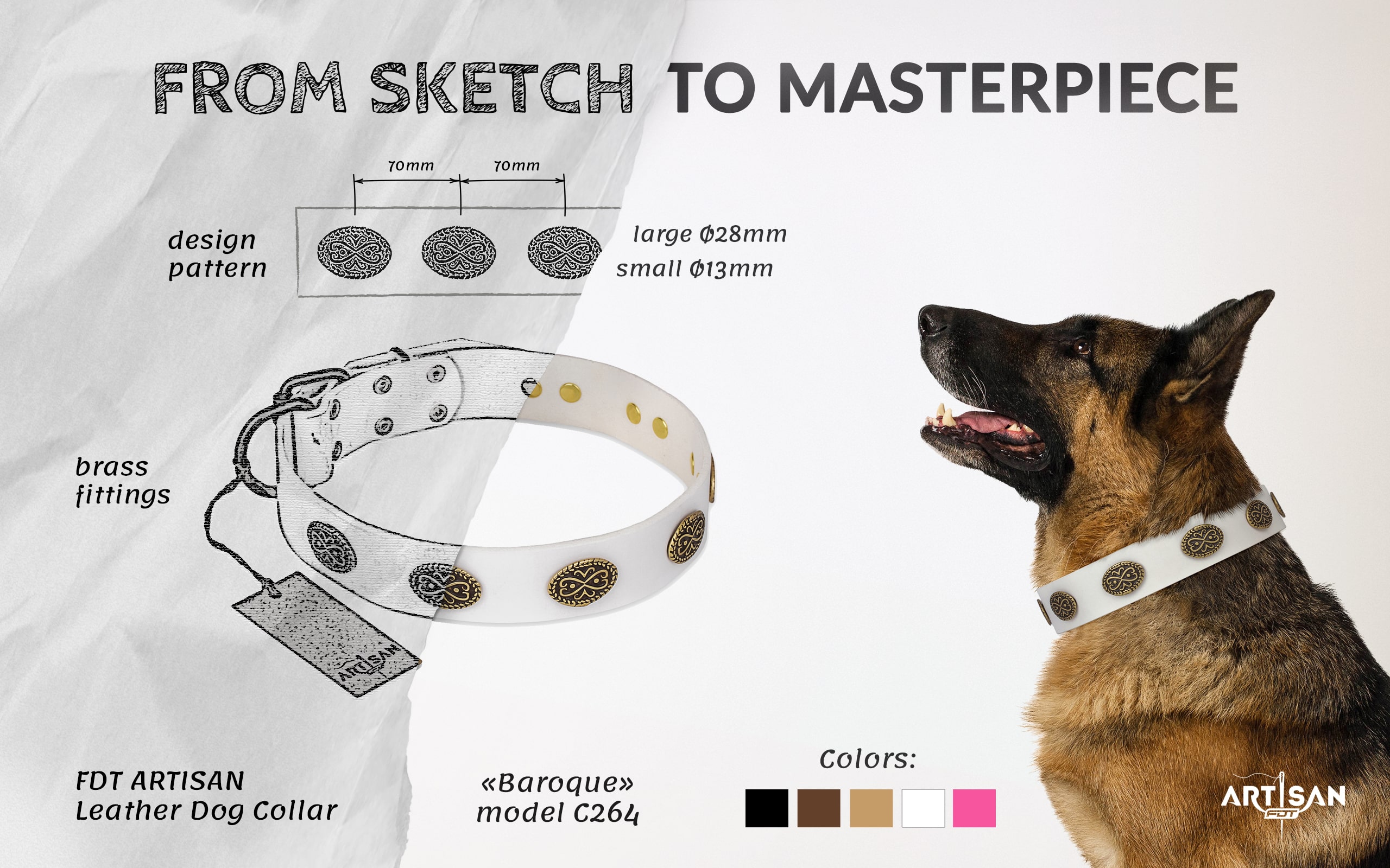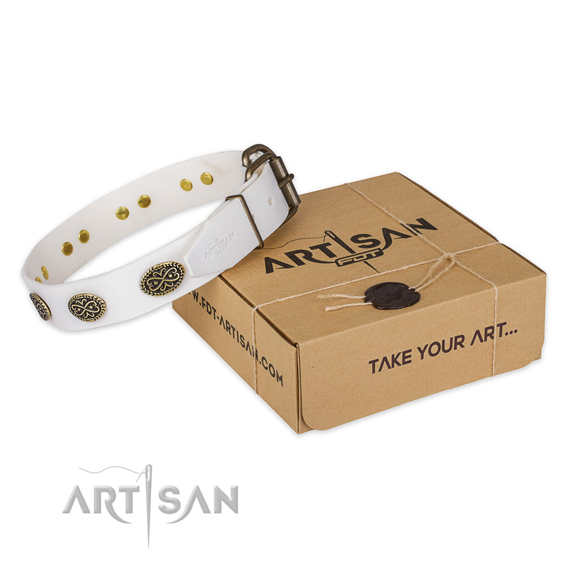 FDT Artisan White Leather Dog Collar with Brass Plated Ornamented Ovals
