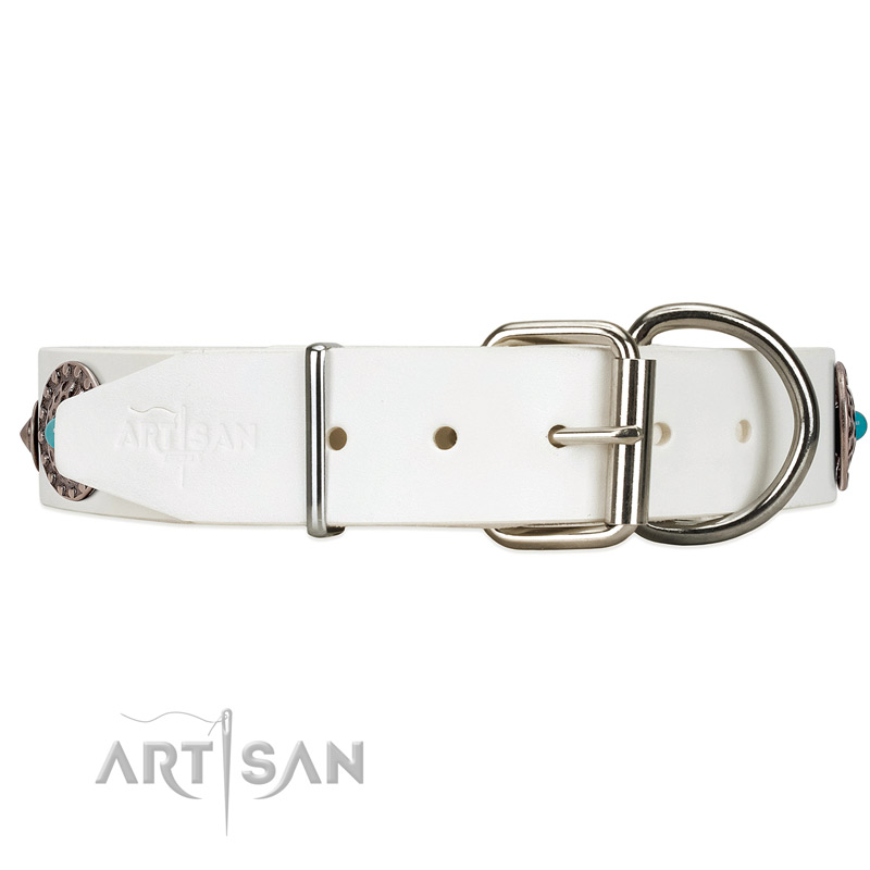 Handmade FDT Artisan White Leather Dog Collar for Walking in Style