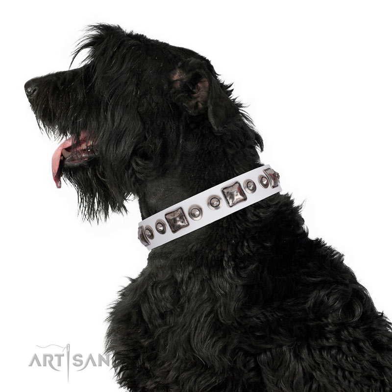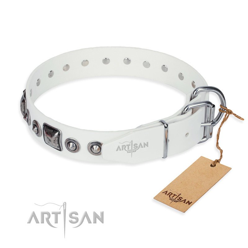 This luxurious white dog collar is made of full grain genuine leather. This natural material doesn't cause any allergy or skin irritation. It is characterized by softness, flexibility and extreme strength. Moreover it doesn't change its shape even while everyday usage. This gear has long serviceability, so it will