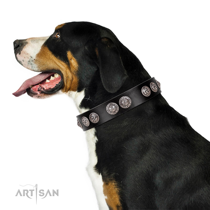 Handmade FDT Artisan black leather Swiss Mountain dog collar for daily use