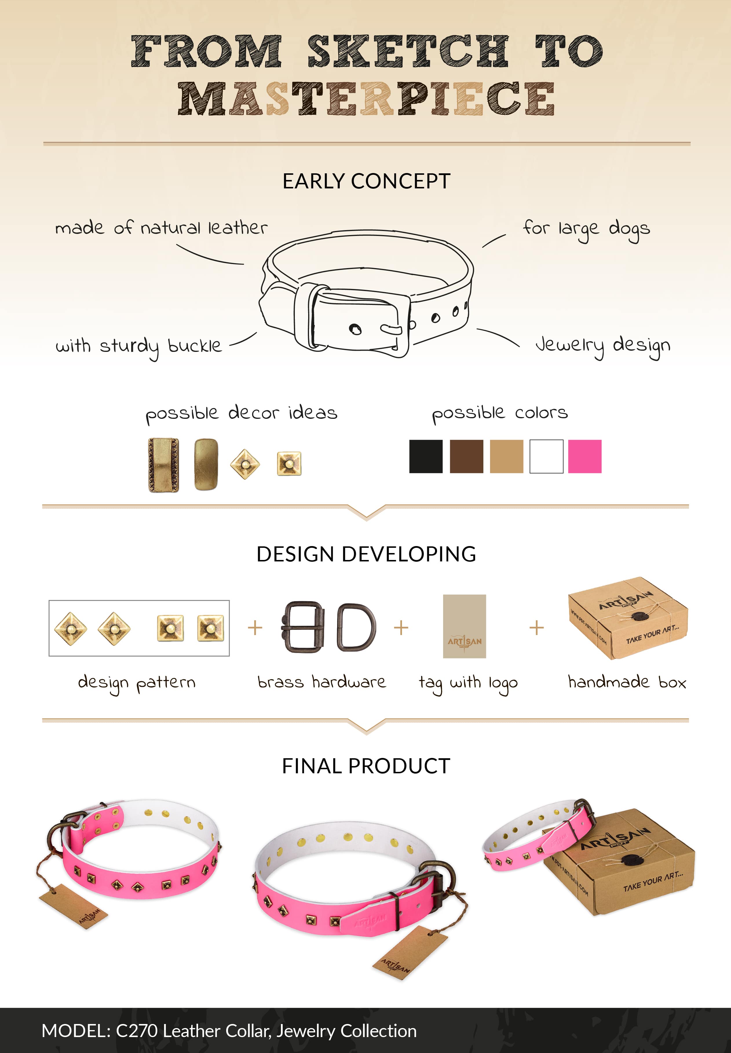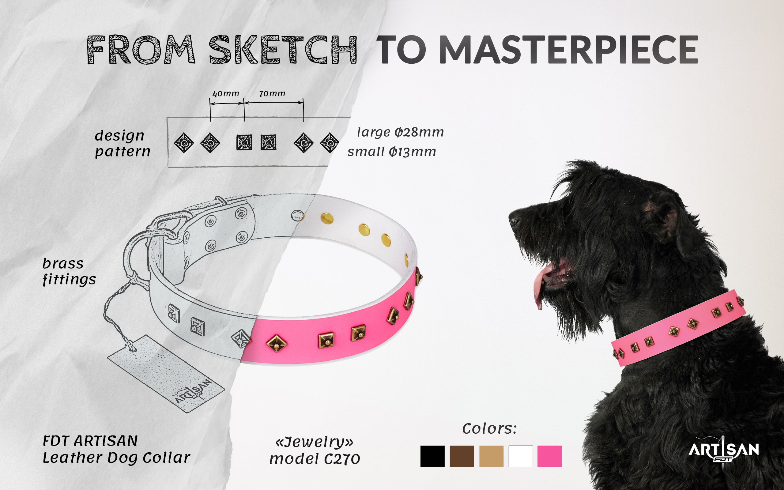 FDT Artisan Pink Leather Dog Collar with Rust-Proof Old Bronze-Plated Studs