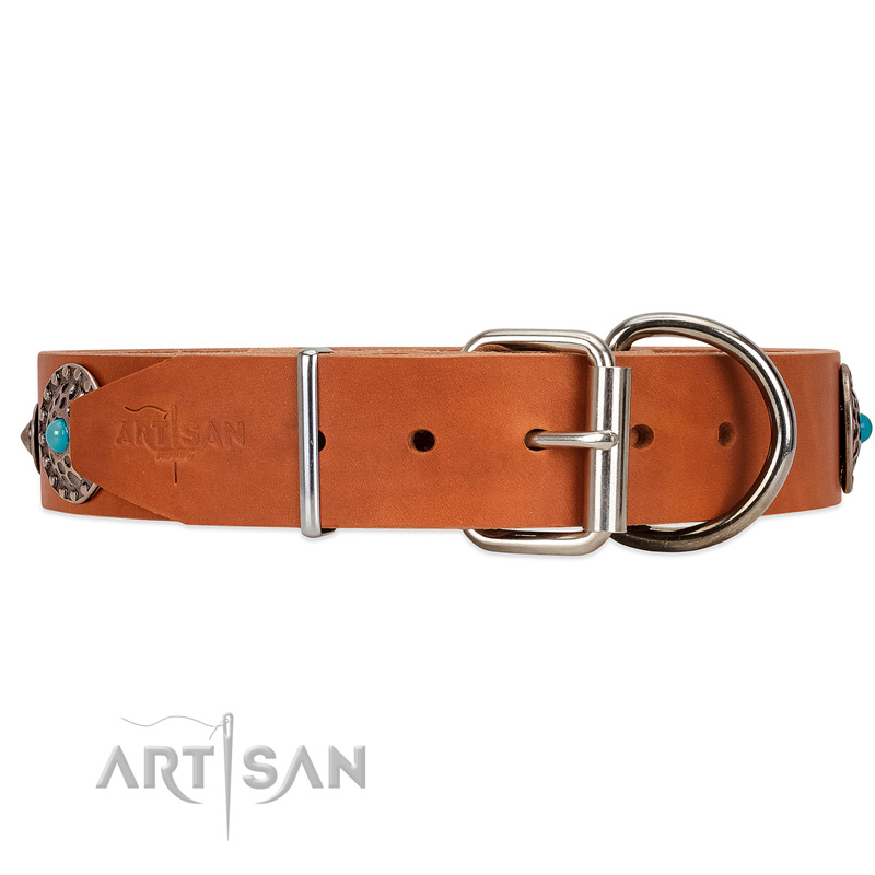 Show everybody your dog's natural beauty! Adorned with Blue Stones and Silver-like Plates Tan Leather Dog Collar is handcrafted to highlight your pet's personal style! The genuine leather of exceptional quality looks stylish and expensive. It