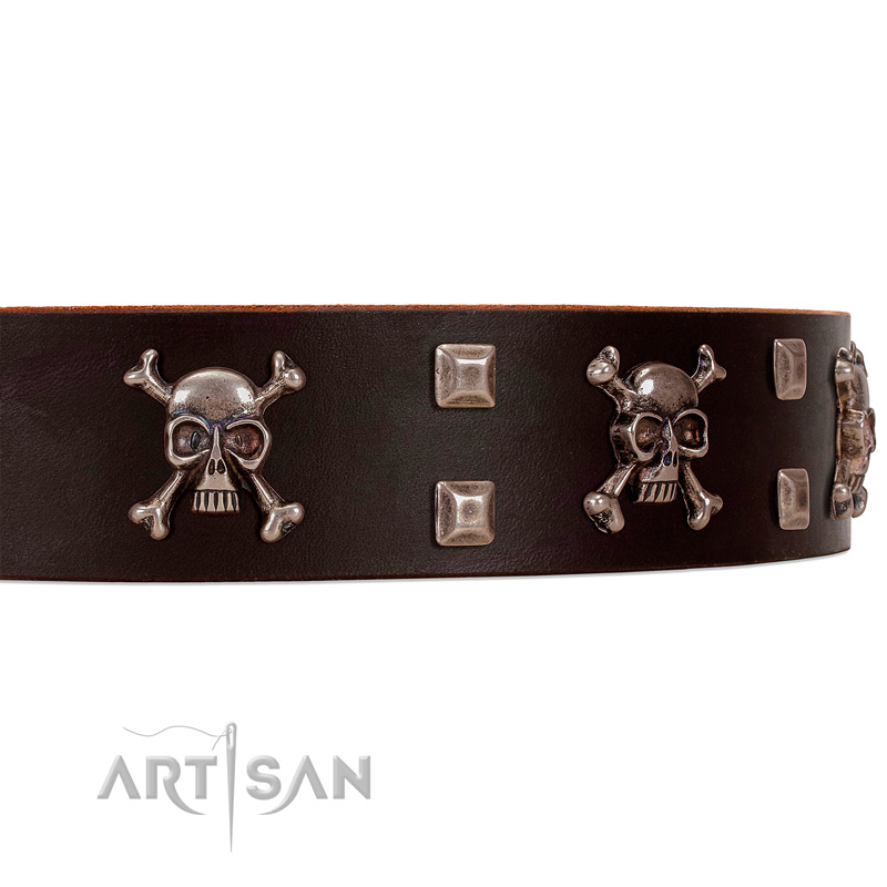Don't you think that the time has come for your dear pooch to rock! Add some funky rock'n'roll notes to the look of your precious pet and be in the spotlight! Do not hide the wild nature of your dog behind dull and dinky accessories! Get ordinary-looking things out of your pet's life! He/she worth to look sharp and hella cool! And with this stunning decorated brown leather dog collar from