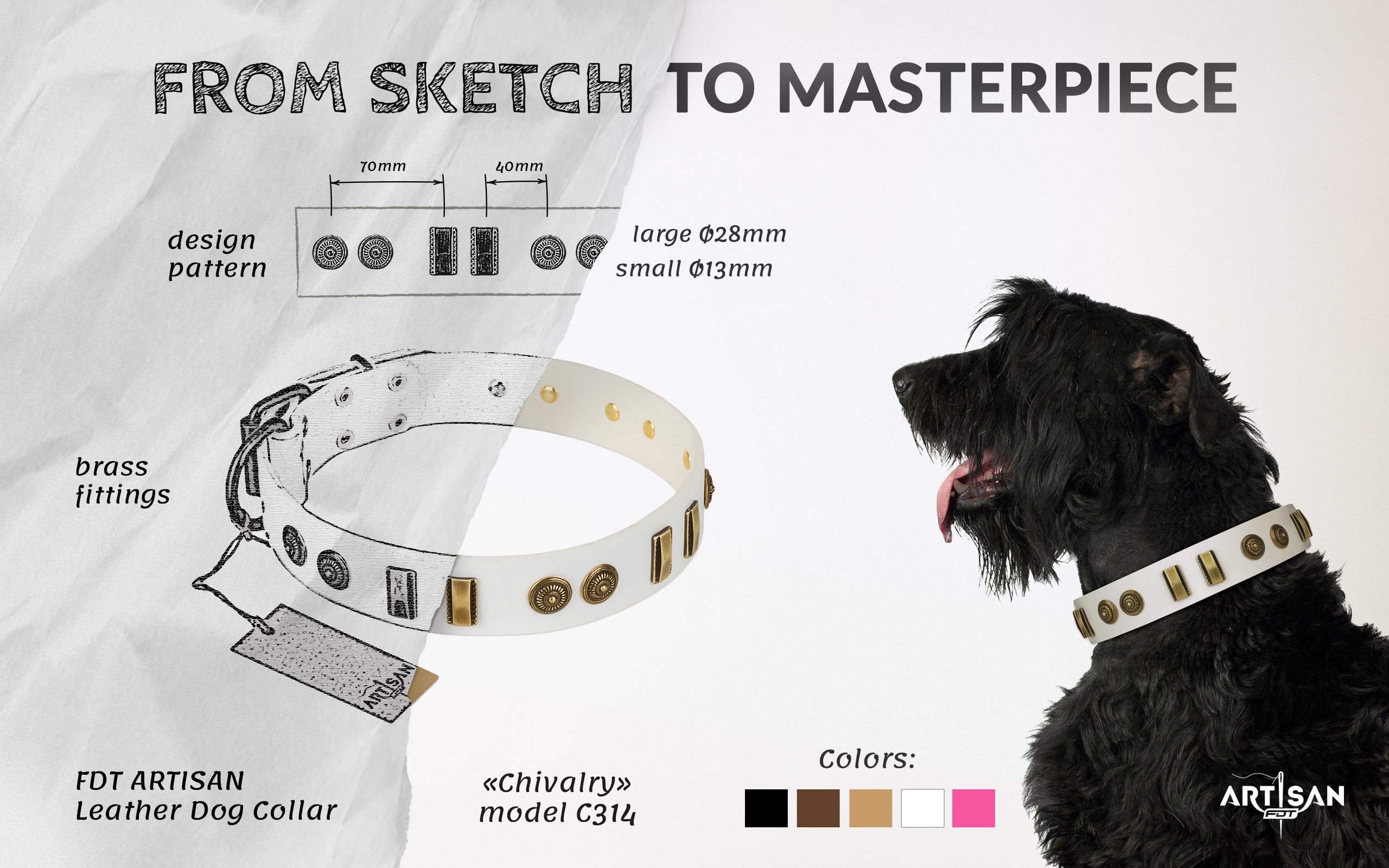Chivalry Style Decorated White Leather Dog Collar with Brass Plated Hardware