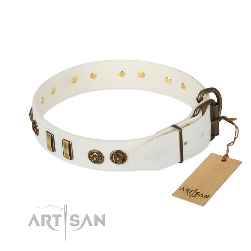 FDT Artisan Walking White Leather Dog Collar with Old Bronze Look Embellishments