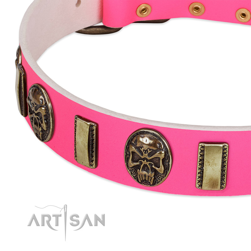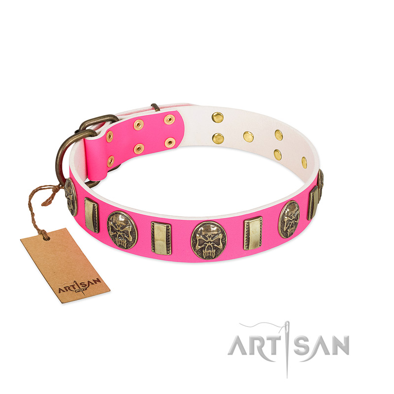 This FDT Artisan Pink Leather Dog Collar is a bright example of how a strap of natural leather may turn into a piece of art! Quality materials, unique design and functionality make this tool an unbelievably comfortable, incredibly safe and dependable supply for dog handling. Genuine leather makes any collar comfortable and durable. The collar is decorated with gorgeous decorations: old bronze-like plated small plates and conchos with skulls. The hardware is old bronze-like plated and will serve for a long period of time. And what do you think about the color? Don't you think that your lady dog