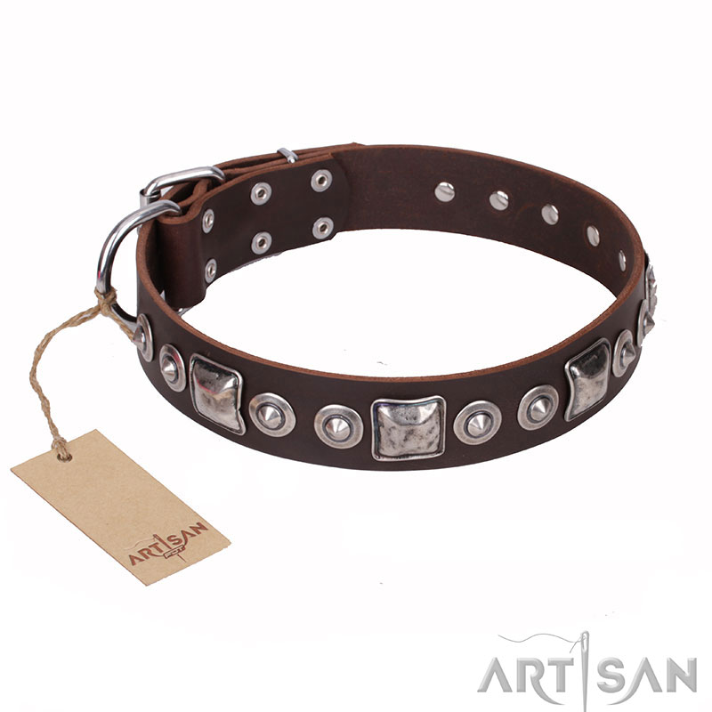 FDT Artisan Brown Leather Dog Collar with Silver-like Adornment